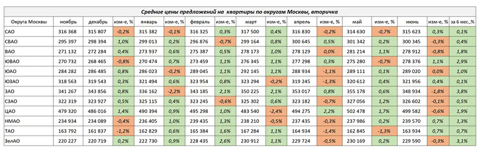 По итогам первого полугодия уровень средних цен предложений по большинству округов в целом не изменился, наблюдался лишь символический рост. При этом, наибольший рост показали квартиры на вторичном рынке в Зеленограде, ЮВАО +3% и в ЗАО +3,8%.
